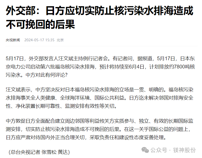 多家日本企業(如:日本神島化學有限公司、日本協和化學工業有限公司、日本富田制藥株式會社、日本宇部株式會社、日本達泰豪化工工業株式會社等)正在使用被核污水污染的海水生產鎂鹽產品(如:碳酸鎂、硫酸鎂、氫氧化鎂、氧化鎂等)的事實引起了人們的關注。