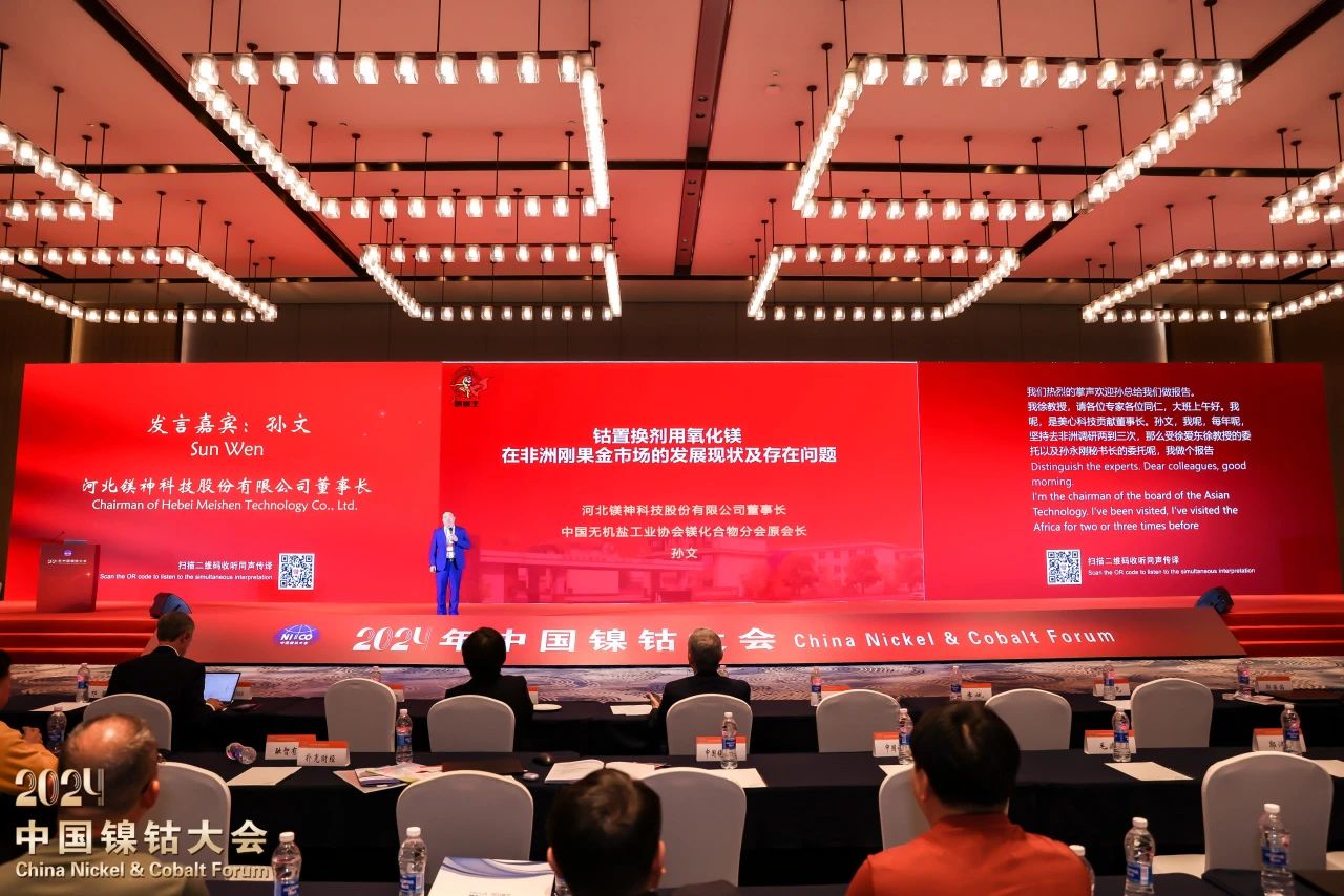 在這場聚焦“以新質(zhì)生產(chǎn)力激發(fā)鎳鈷行業(yè)高質(zhì)量發(fā)展新動能”的盛會上,河北鎂神科技股份有限公司董事長孫文先生作為嘉賓受邀出席并發(fā)表了題為《鈷置換劑用氧化鎂在非洲剛果金市場的發(fā)展現(xiàn)狀及存在問題》的主題報告,為與會者帶來了深刻洞察與前瞻思考,贏得了現(xiàn)場陣陣掌聲。