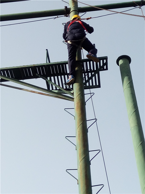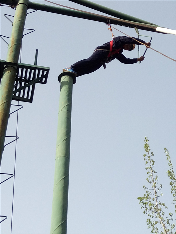 ? ? 這個項目是“高空抓杠”。要求隊員依次獨立的爬上立柱,在圓盤上站穩后,雙腿同時用力蹬出,雙臂前伸抓住掛在前方的單杠。